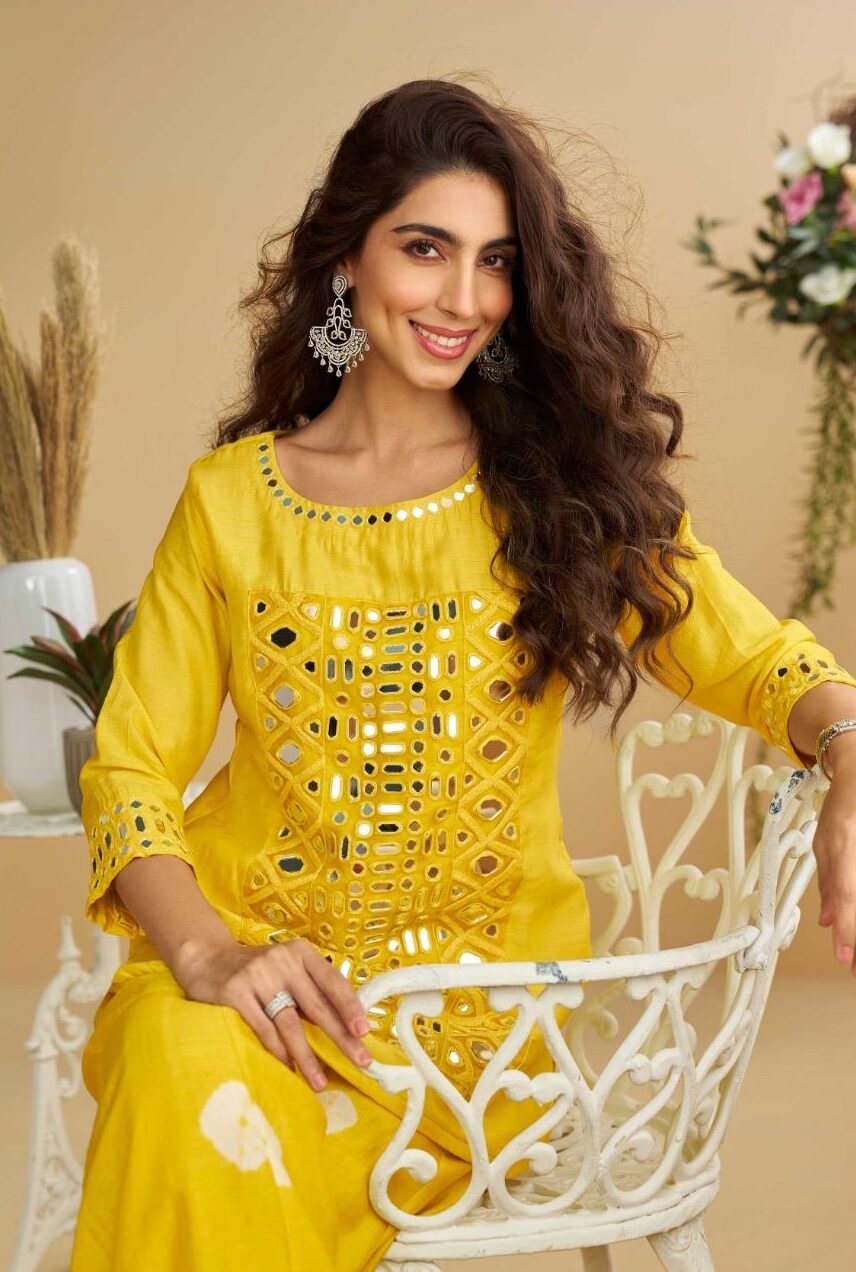 FABRIC – PREMIUM REAL SILK ( TREDY FESTIVE LOOK EMBROIDERED MIRROR WORK TOP WITH PLAZZO PANT AND EMBROIDERED ORGANZA DUPATTA )