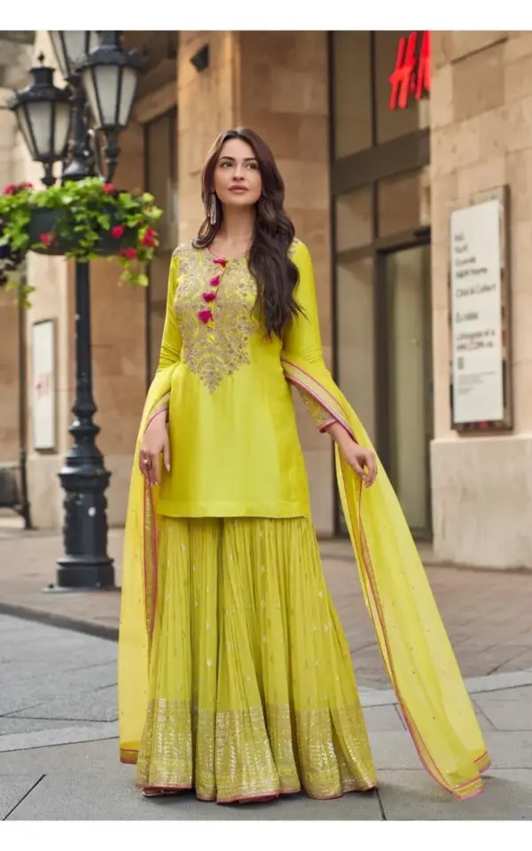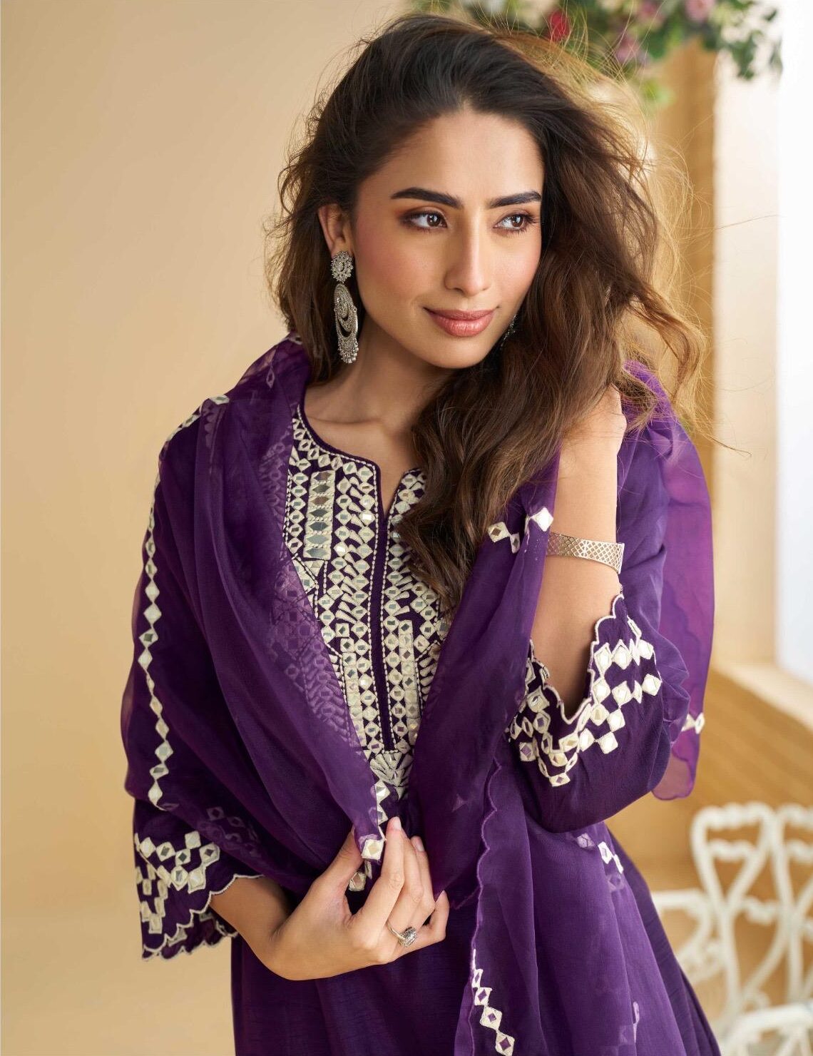 FABRIC – PREMIUM REAL SILK ( TREDY FESTIVE LOOK EMBROIDERED MIRROR WORK TOP WITH PLAZZO PANT AND EMBROIDERED ORGANZA DUPATTA )