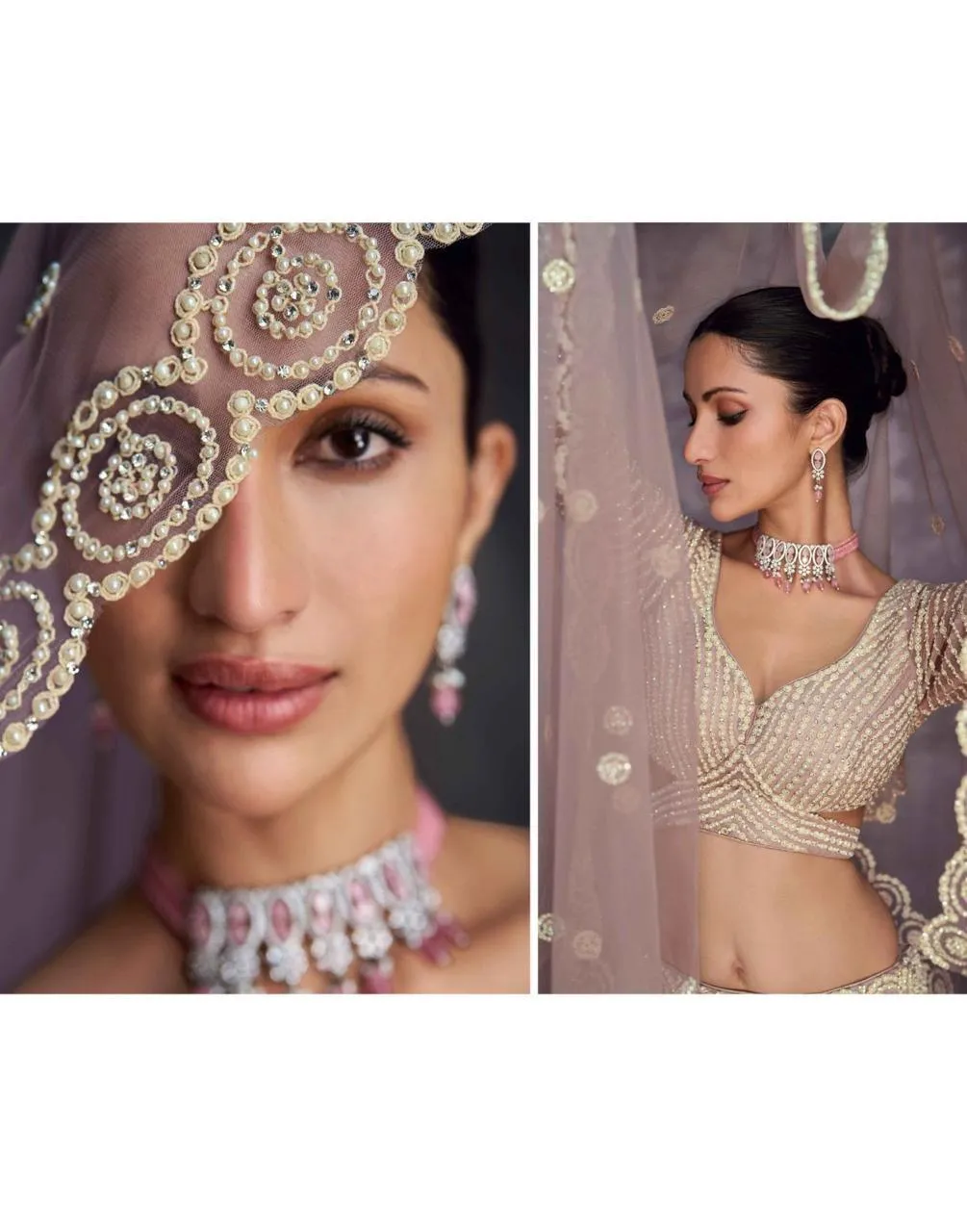 Details | Pure Net Fully Embroidered with Hand Moti and Seroski Hand Diamond (Front and Back Full Handwork Embroidered with Cancan) |