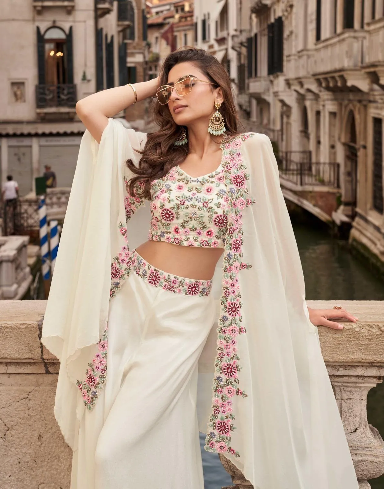 Details | Premium Real Chinon Silk / Viscos Jacquard Silk (Tredy Festive Look Front And Back Embroidered Shrug With Embroidered Blouse On Hand Embellished Mirror Work With Stylist Plazzo) |