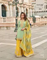 | Details | Premium Real Simar Silk / Viscos Jacquard Silk / Real Chinon Silk (Heavy festive look top with front and back embroidered sharara with digital embroidered dupatta) |
