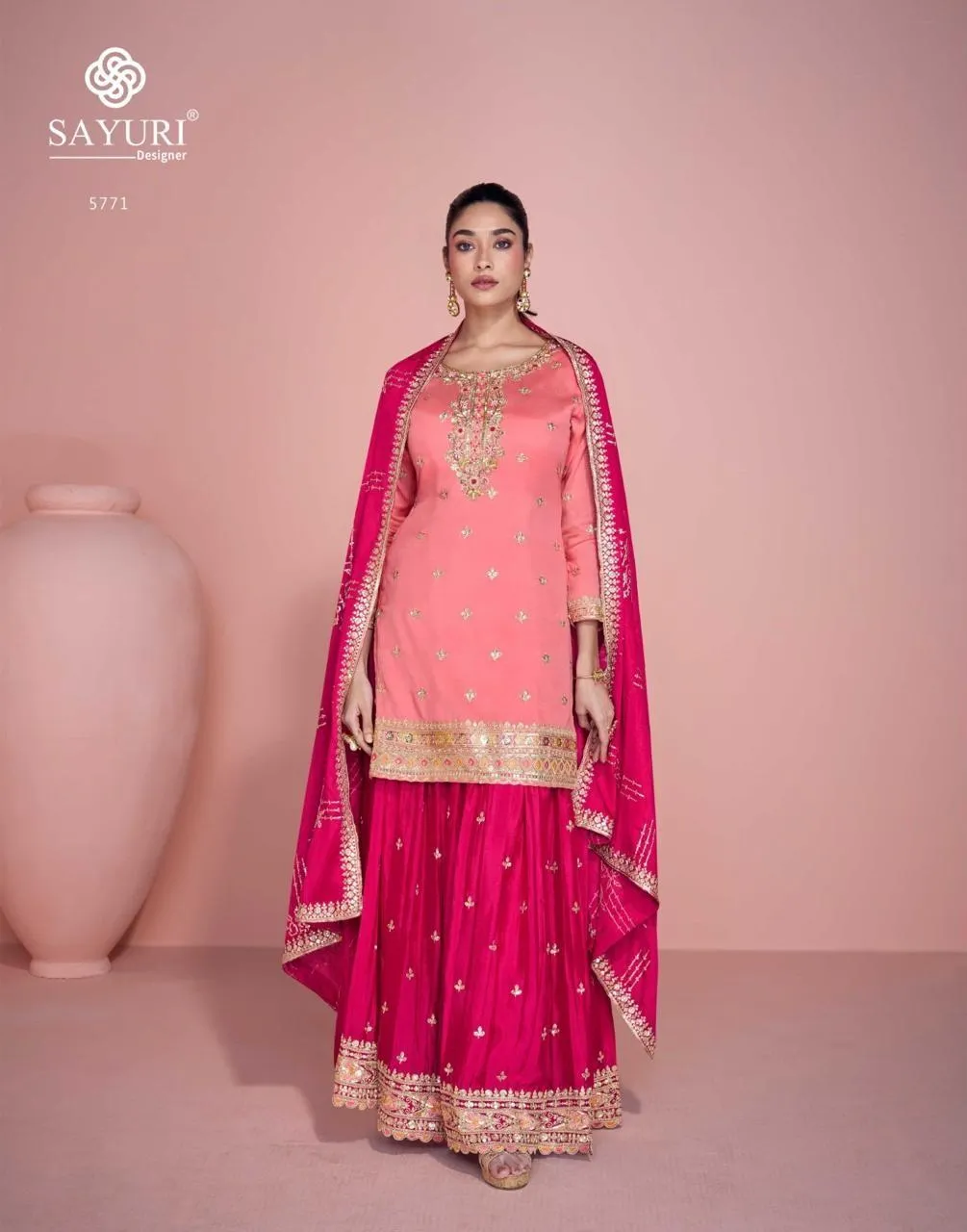 Details | Premium Real Chinnon Silk / Premium Silk (Heavy Look Embroidered Chinnon Silk Top with Front and Back Embroidered Sharara, Embroidered Dupatta) |