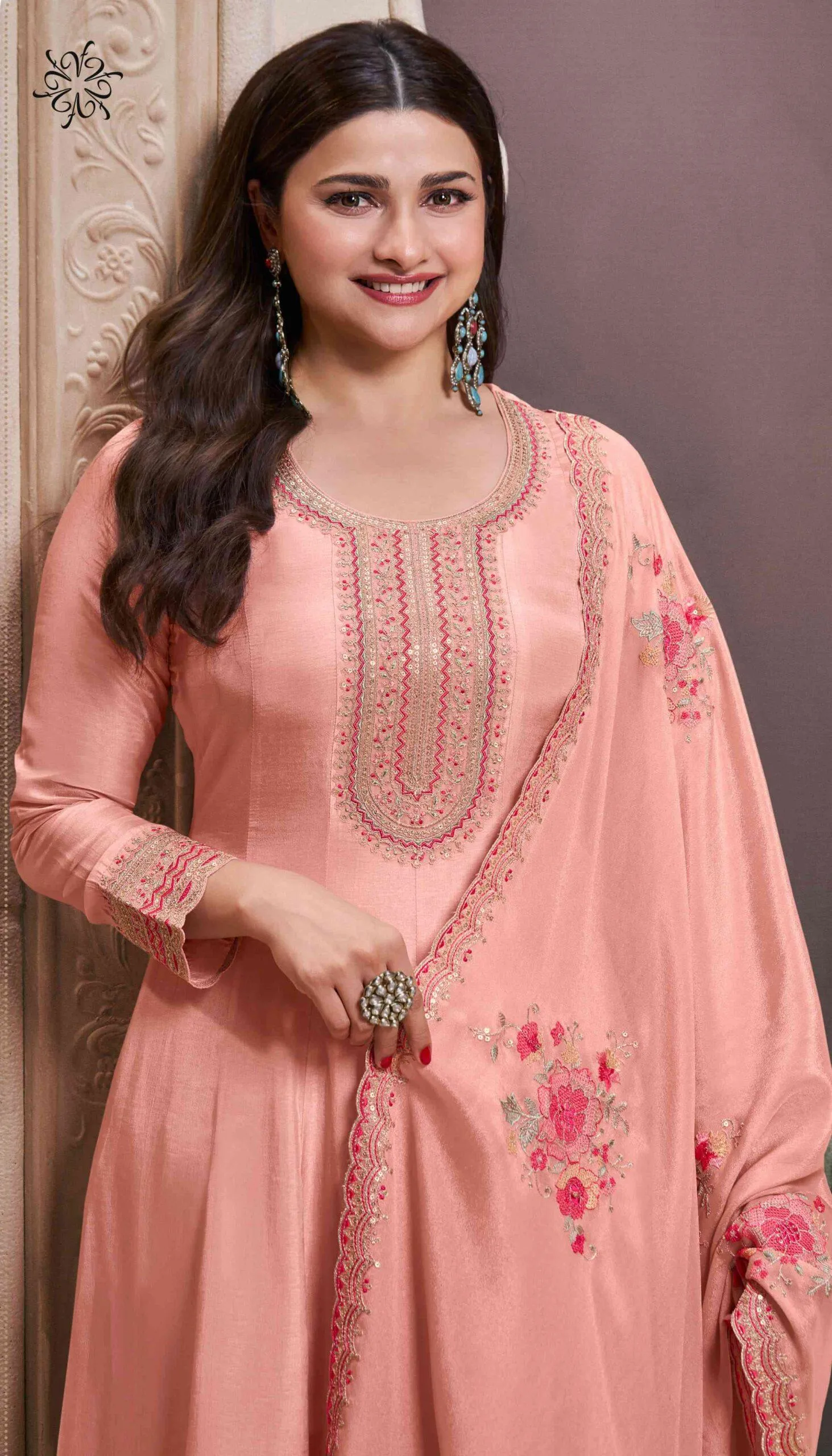 Details Thread Emb Moonga Silk Top, Santoon Bottom, Multy Thread Emb Silk Georgette Dupatta ( Semi Stitched Product )